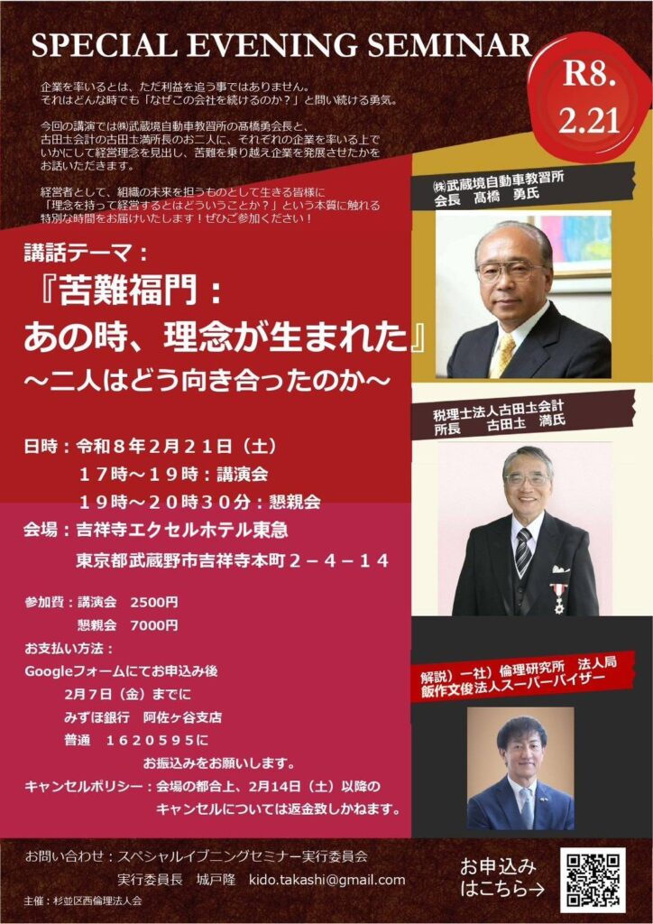 | 詳細 | ○テーマ 『苦難福門:あの時、理念が生まれた』~二人はどう向き合ったのか ○講話者:株式会社武蔵境自動車教習所 会長 髙橋勇氏、税理士法人 古田圡会計 所長 古田圡満氏 ○解説者:法人スーパーバイザー 飯作文俊氏 |