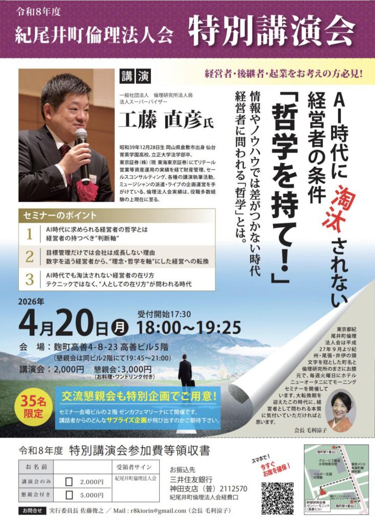 | 詳細 | ○講演 一般社団法人倫理研究所法人局 法人スーパーバイザー 工藤直彦氏 AI時代に淘汰されない経営者の条件「哲学を持て!」~情報やノウハウでは差がつかない時代 経営者に問われる「哲学」とは。 |
