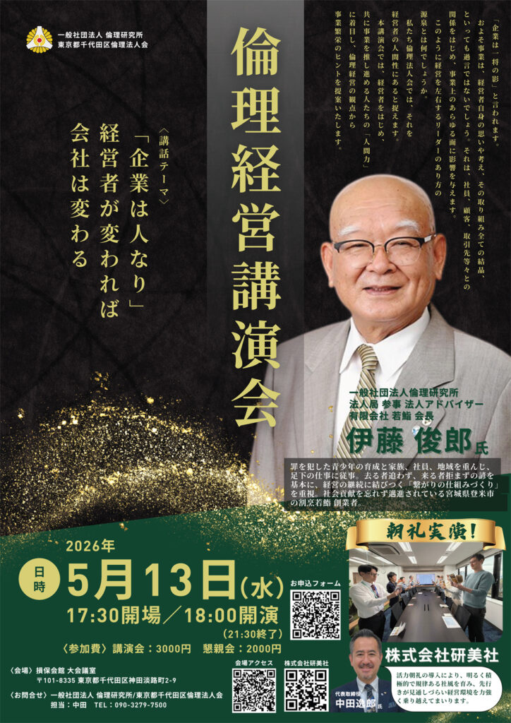 | 詳細 | 〇テーマ:企業は人なり―経営者が変われば会社は変わる 〇講師:法人アドバイザー 伊藤俊郎 氏 〇朝礼実演 |