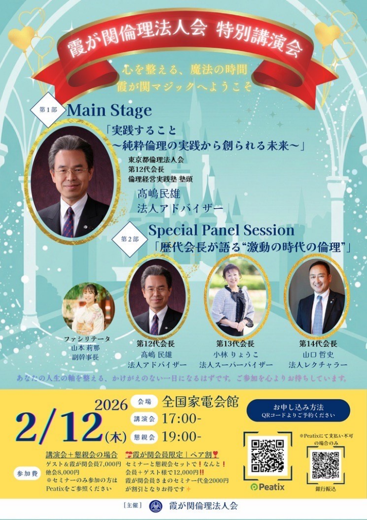 | 詳細 | ○テーマ第一部「実践すること 〜純粋倫理の実践から創られる未来〜」、第二部「歴代会長が語る“激動の時代の倫理”」○登壇者 髙嶋民雄 法人アドバイザー、小林りょうこ 法人スーパーバイザー、山口哲史 法人レクチャラー |