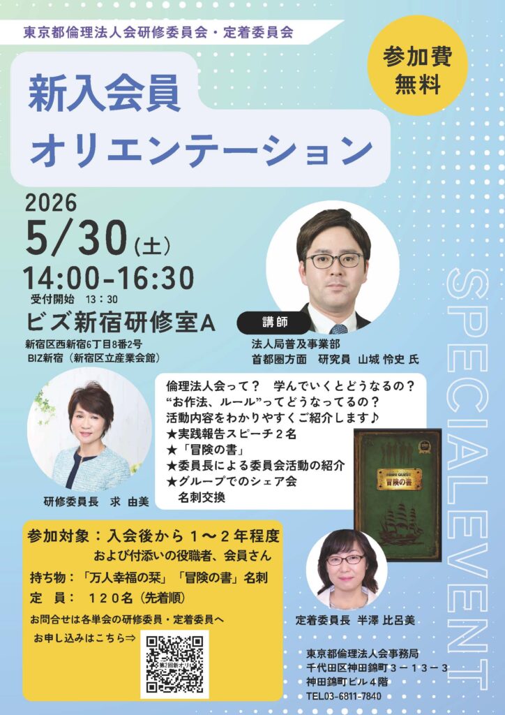 2026年5月30日(土)14:00-16:30 受付開始13:30 会場:ビズ新宿研修室A 東京都新宿区西新宿6-8-2 Biz新宿 ○講師 一般社団法人倫理研究所 法人局普及事業部 首都圏方面研究員 山城怜史 氏 ○参加対象者:入会後から1~2年程度および付添いの役職者、会員さん 持ち物:『万人幸福の栞』『冒険の書』名刺